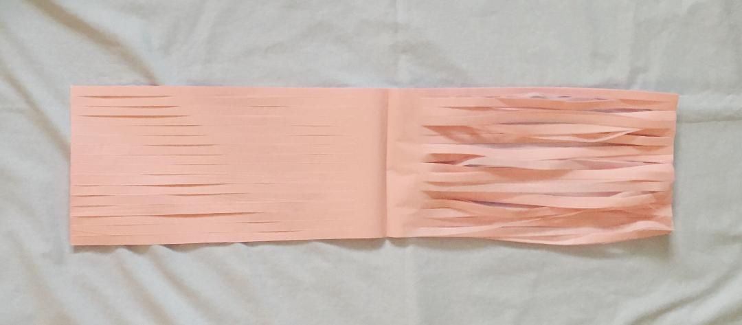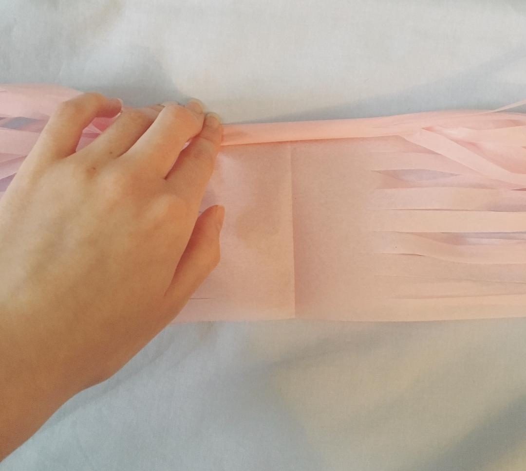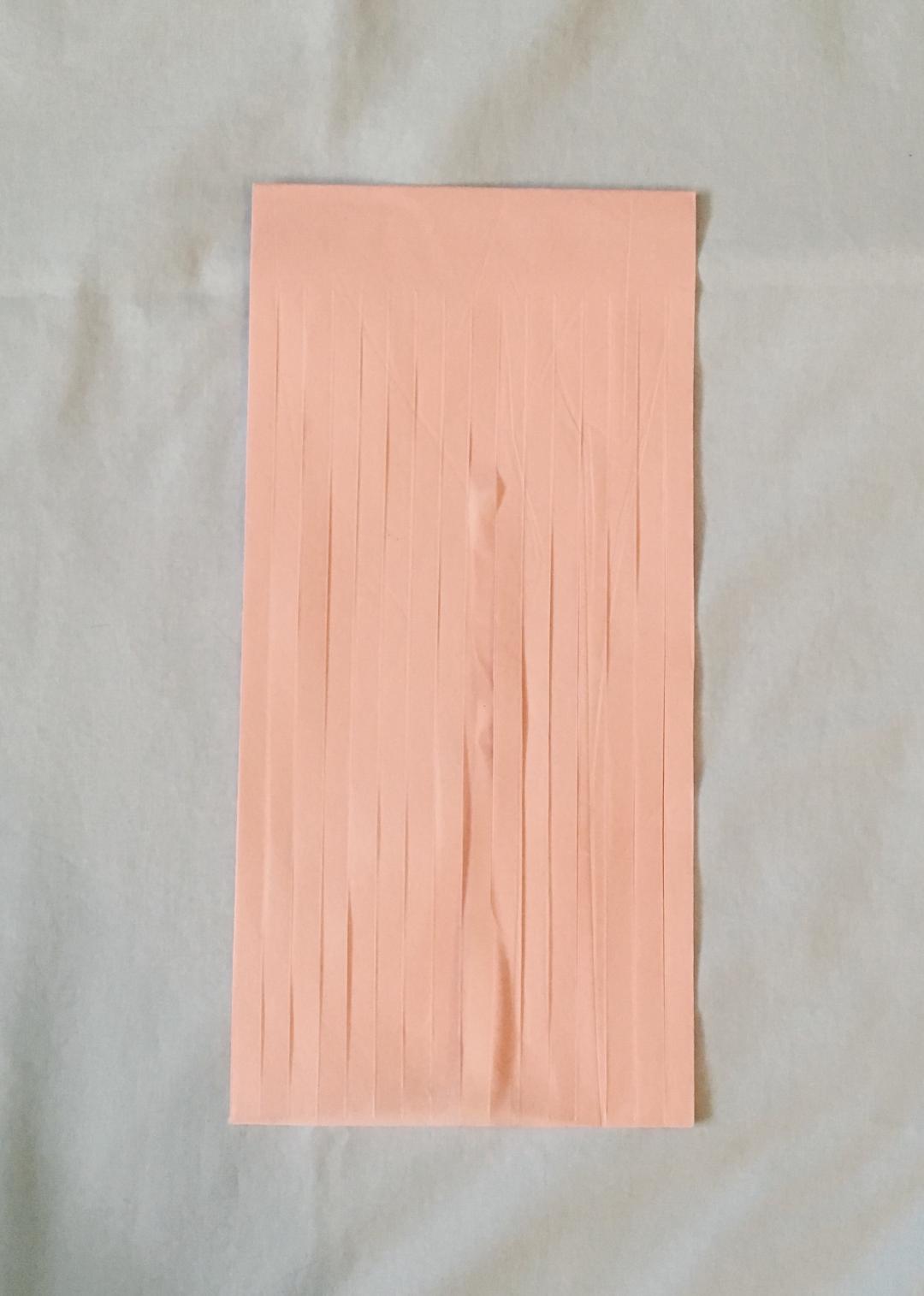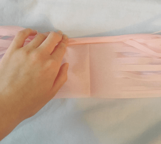I began by removing one colour of tissue paper from the packet. If you are using your own tissue paper you will need to fold your chosen colour in half and using a ruler, pencil and scissors, cut straight lines about 1cm apart leaving an inch (2.5cm) gap at the folded edge.
