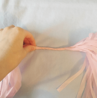 Then fold over the middle and twist it together slightly to form a loop and wrap about an inch of tape at the bottom of the loop to secure the tassel.