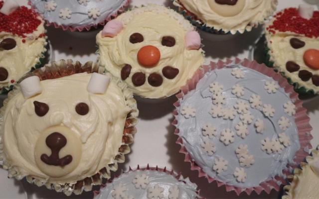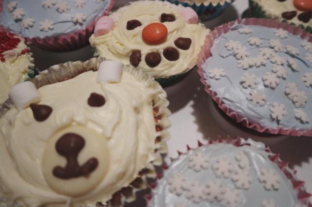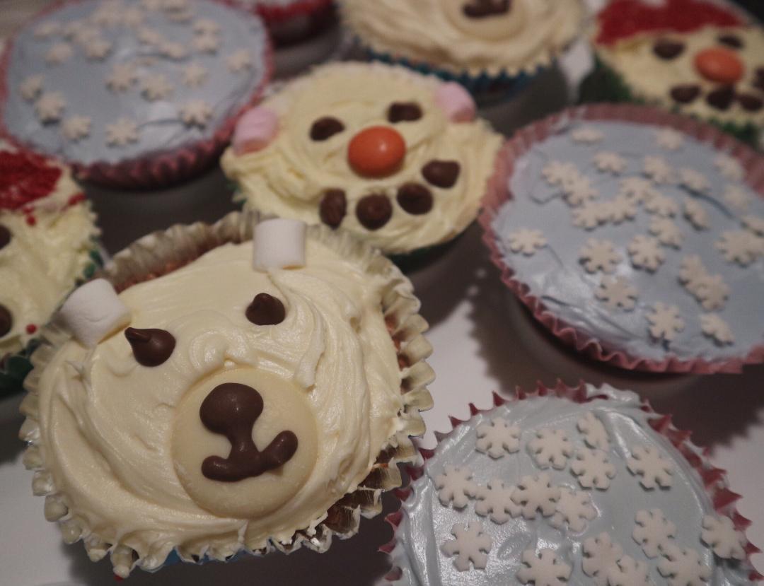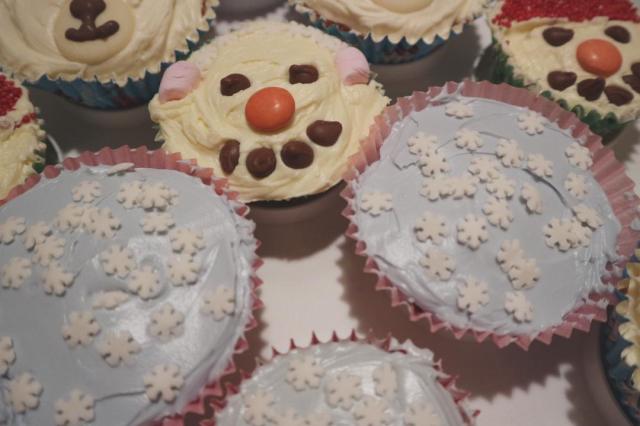 Polar Bear Cupcakes – I again smoothed some Betty Crocker Velvety Vanilla Buttercream onto each cupcake (It was on offer and it tastes so nice – and also saves time too!). I used a giant Milkybar button and some milk chocolate writing icing to create the nose and mouth. Then I added 2 chocolate chip eyes and 2 marshmallow ears!