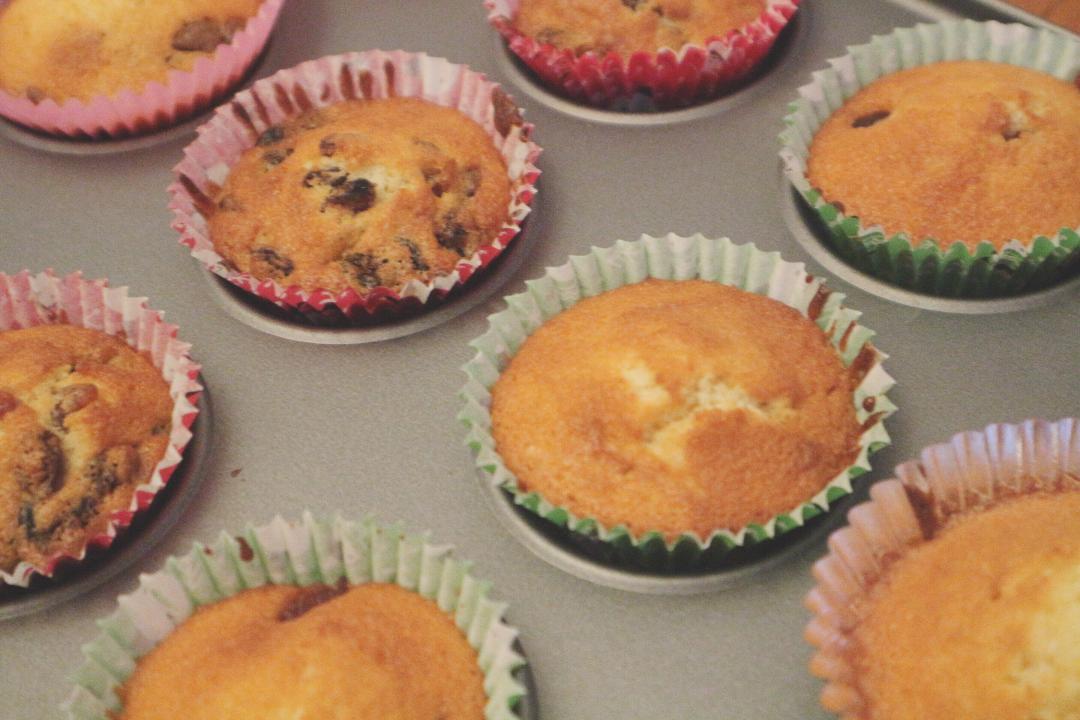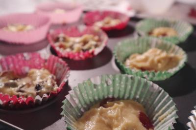 6. Add your desired flavourings; this time I divided my mix into 4 and did a some plain, some chocolate chip, some cherry and some with dried mixed fruit as it’s almost Christmas. *hehe* I kinda couldn’t decide which flavour to make so I decided to make a couple of each – I used different coloured cases to signify different flavours.