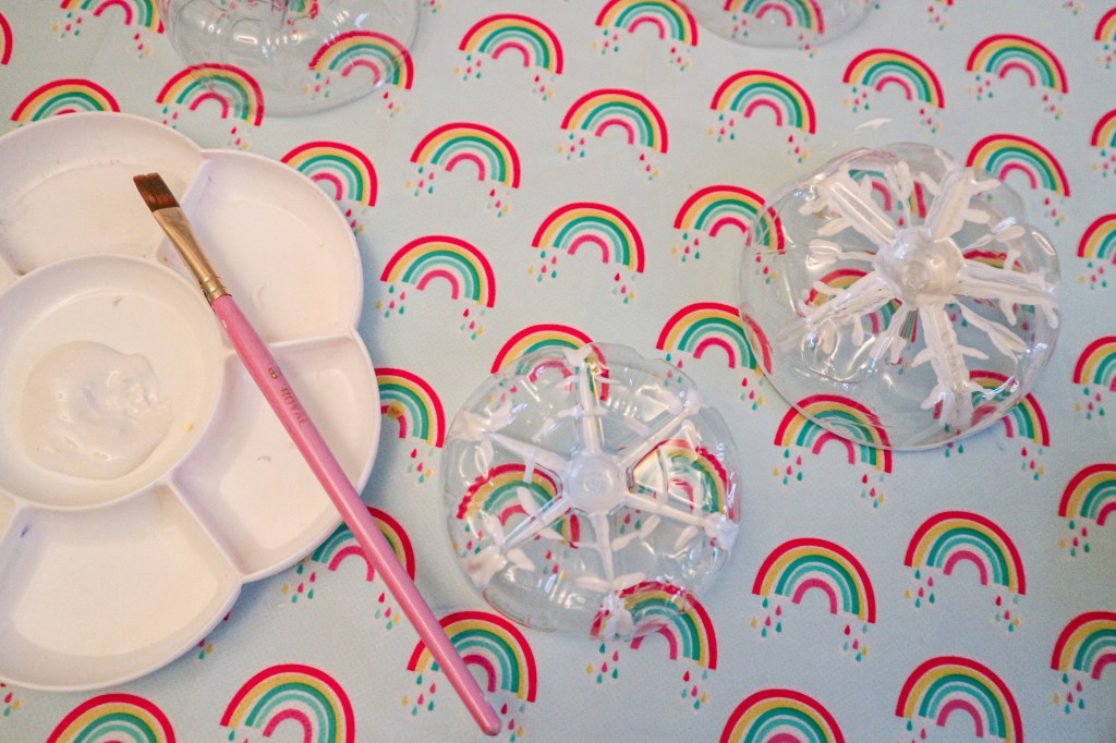 2. Next on the inside of the bottom of the plastic bottle paint your snowflake design. We used the grooves in the bottom of the plastic bottle as a guide to create a symmetrical design.