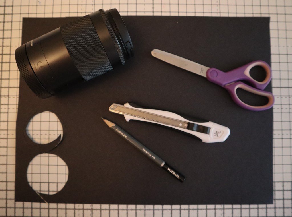 Firstly, trace around your camera lens on a black sheet of card. I tried first with white printer paper, but it was too flimsy and kept falling off the camera or getting creased and misshapen, so I recommend using card if you have any, any colour will work however black is recommended as it won’t let light through, but other colours can create cool colourful effects on your photos.
